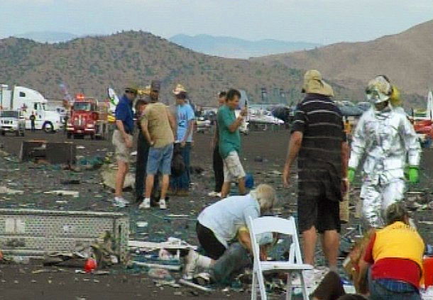 На месте падения самолета образовалась глубокая воронка. До столкновения там находилось кресло Грега Шваба, зрителя из VIP-ложи. Он вышел из ложи за несколько минут до катастрофы, а когда вернулся, площадка больше напоминала бойню. «Словно там произошло массовое убийство или взрыв бомбы, — делится Шваб. — Лежало много людей, у которых оторвало руки и ноги. Один парень был разорван пополам. Помню, кто-то крикнул: «Эй, тут чья-то нога!» Шваб бросился к ближайшим раненым, пытаясь помочь им остановить кровь. Вскоре прибыли первые машины с медиками.