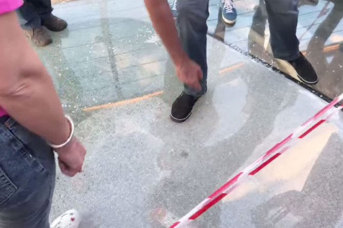 Некоторые участки моста огорожены, а несколько стеклянных вставок треснули. Кличко решил проверить прочность одного из покрытий и приподнял его. В итоге стекло рассыпалось на мелкие кусочки.
