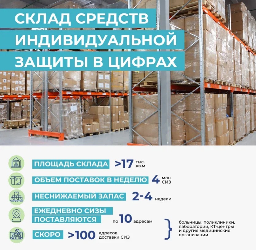 Новый склад средств индивидуальной защиты для медицинских работников является крупнейшим в Москве логистическим комплексом площадью более 17 тысяч квадратных метров. Он находится в транспортной доступности ко всем городским клиникам, что позволяет сократить время поставки. Еженедельно в круглосуточном режиме осуществляется пополнение запасов и снабжение организаций.