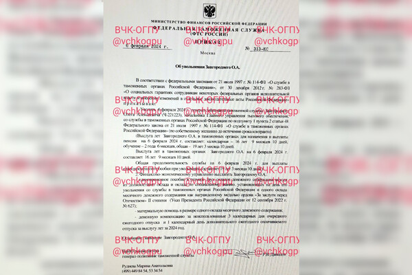 Генерал Завгородний уволился 6 февраля по собственному желанию, сообщили РБК в пресс-службе ФТС. По информации телеграм-канала ВЧК-ОГПУ (признан в РФ иностранным агентом), он уволен «со всеми привилегиями и компенсациями».