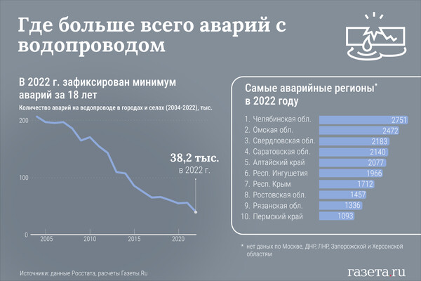 Последние данные о состоянии ЖКХ, собранные Росстатом, относятся к 2022 году. В них перечислены количество поломок и изношенность коммуникаций.