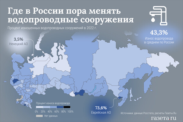 По количеству водопроводных сооружений, которые нужно менять, на первое место вышла Еврейская автономная область — 73,59% от всей сети. Следующие в антирейтинге Севастополь (66,4%) и Новгородская область (64,7%). Примечательно, что между изношенностью и авариями нет связи.