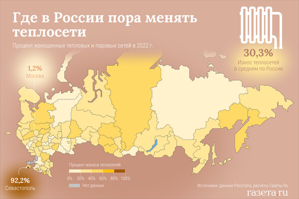 Изношенных тепловых и паровых коммуникаций в России, по данным Росстата, около 30%. Значение почти достигло рекордного показателя 2019 года. Тогда ведомство оценило его в 51,6 километра сетей. Спустя три года их стало меньше всего на тысячу километров.