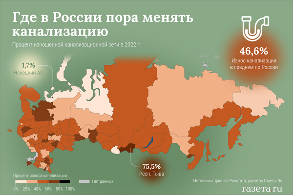 Самая плачевная ситуация — с состоянием канализационных сетей. Доля труб и коллекторов, отслуживших свой срок, достигла 47%.