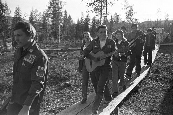 Студенты Московского института инженеров транспорта возвращаются с дневной смены на строительстве БАМа, 1975 год