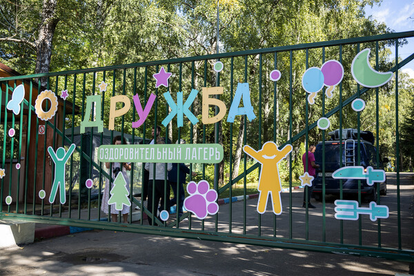Веселая разноцветная надпись на воротах бывшего советского санатория — «Дружба». Рядом мусорные баки и черно-белые противотанковые ежи. Вход закрытый, мне разрешают ходить по территории только с сопровождением. Директор лагеря Станислав Новиков сразу ведет на главную площадь, где нас уже ждет небольшая толпа. «Они очень переживают [из-за вашего приезда], стесняются. Люди с деревень», — по дороге предупреждает Новиков.