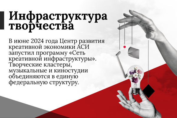 Точкой сборки российской и международной экспертизы стал Центр развития креативной экономики АСИ. Именно здесь соединяются усилия институтов развития, продюсеров и специалистов креативных индустрий, представителей смежных отраслей и профильных сообществ, заинтересованных в совместном развитии российской экономики.