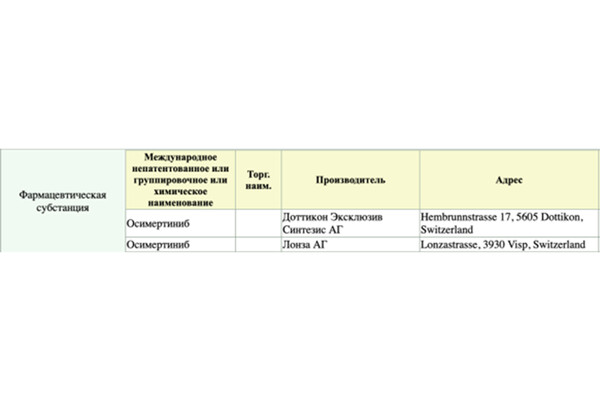 Однако это противоречит информации, которая отражается в Государственном реестре лекарственных средств. Здесь в качестве производителя действующего вещества — осимертиниба указаны швейцарские компании Доттикон Эксклюзив Синтезис АГ и Лонза АГ.