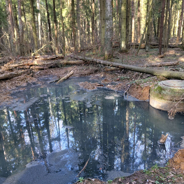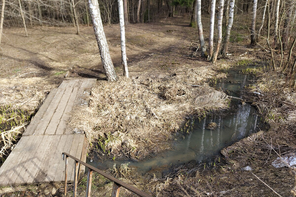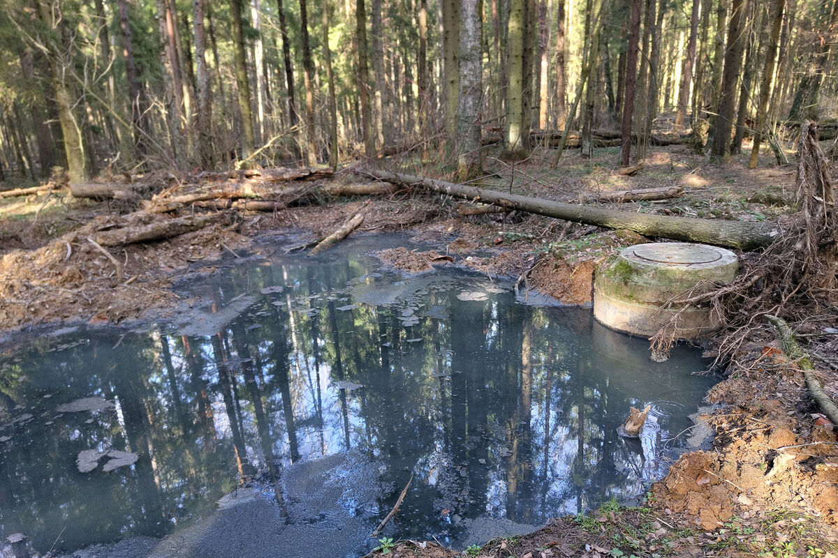 Местные активисты ведут меня в лес на «краеведческую экскурсию», как они ее в шутку называют, к достопримечательности — большому мутному ручью из канализационного колодца, который пересекает чащу и впадает в реку Скалбу, проходящую через город.