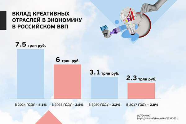 Вклад креативных отраслей в экономику постоянно растет. По итогам 2024 года они обеспечили 7,5 трлн рублей или 4,1% в российском ВВП. Кажется, что немного, но в 2017 году этот показатель был на уровне 2,8% (2,3 трлн рублей), в 2020 году — 3,2% (3,1 трлн рублей), а в 2023 году — 3,8% или 6 трлн рублей.