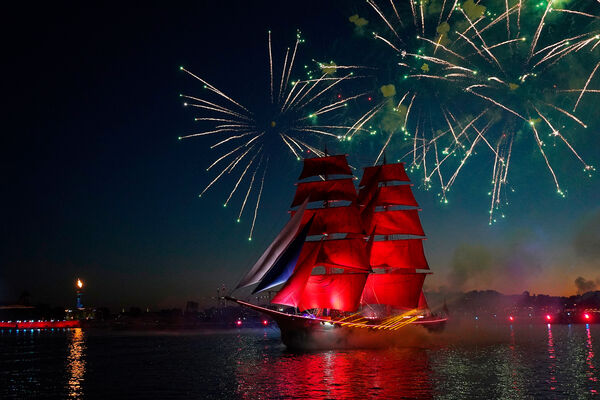 По окончании концерта после полуночи, около 0:40, по Неве торжественно пройдет бриг «Россия» под алыми парусами. Он символизирует галиот «Секрет», который ждала Ассоль в повести-феерии Александра Грина. В это время выпускники переместятся на Дворцовую и Адмиралтейскую набережные, чтобы насладиться красивым и торжественным зрелищем и пиротехническим шоу.