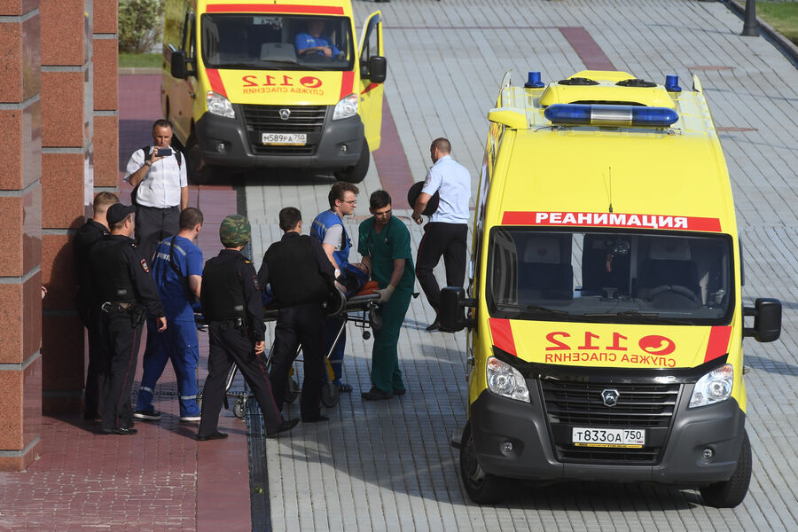 Сотрудники медицинской службы транспортируют раненого к автомобилю скорой медицинской помощи у здания Московского областного суда после попытки побега троих арестованных из банды ГТА, 2017 год