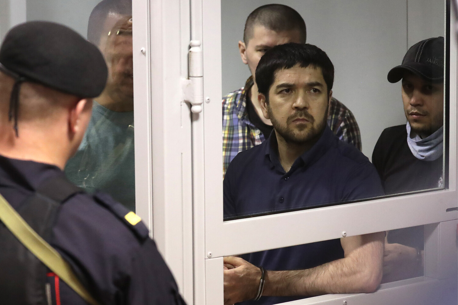 Члены банды ГТА Анвар Улугмурадов, Зафартжон Гулямов, Умар Хасанов и Шерозджон Кодиров (слева направо на втором плане) во время оглашения приговора пятерым членам банды GTA, обвиняемым в убийствах и бандитизме, в Московском областном суде, 2018 год