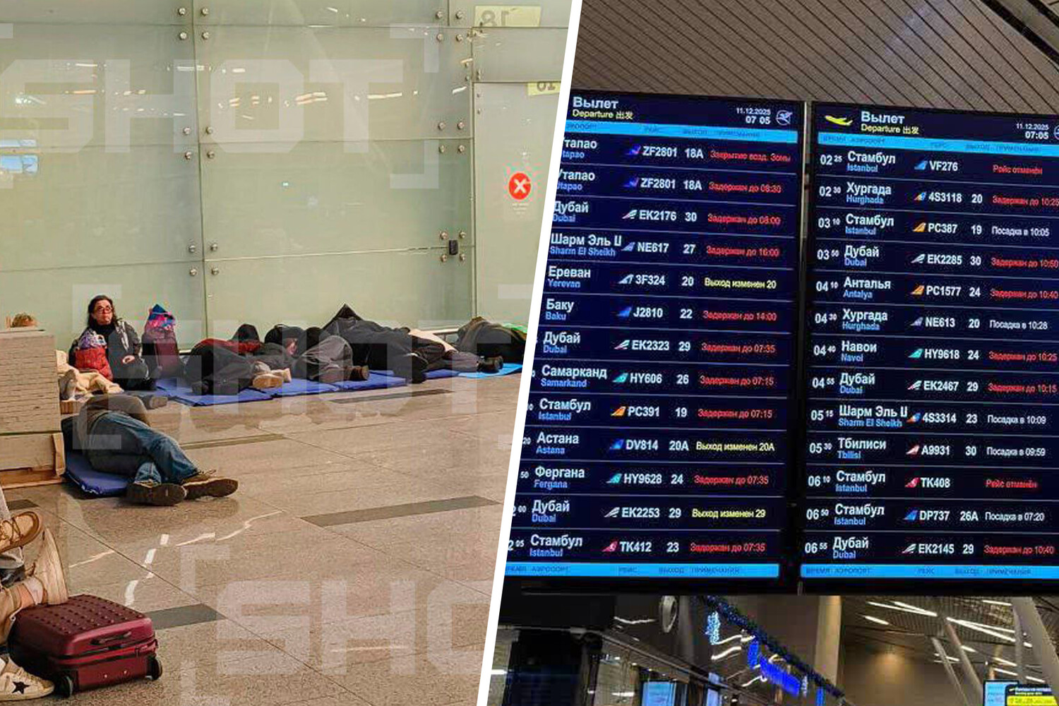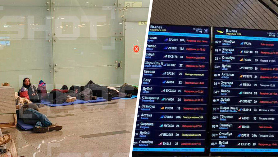 Пассажиры в ожидании вылета были вынуждены спать на туристических ковриках, картонках и скамейках, пишет SHOT. Такая обстановка наблюдалась во Внуково.