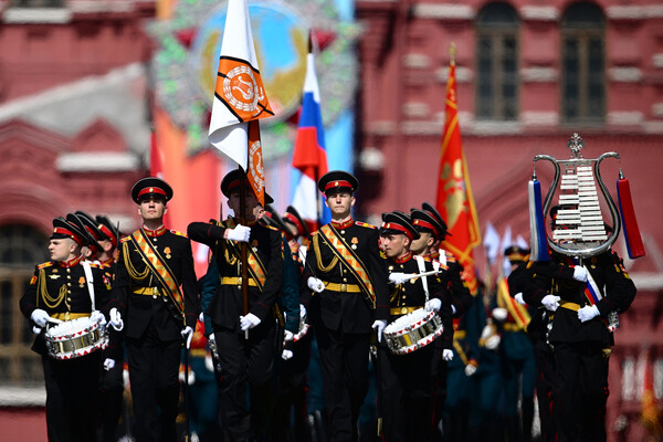Музыканты военного оркестра на военном параде, посвящённом 78-й годовщине Победы в Великой Отечественной войне, на Красной площади в Москве