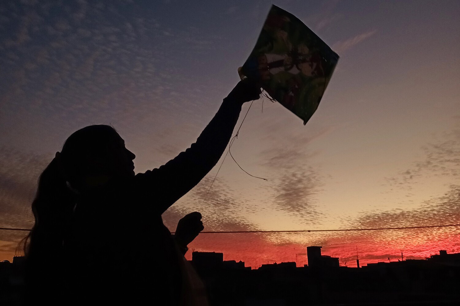 Женщина запускает воздушного змея в Беаваре, Раджастан, Индия, 14 января 2021 года