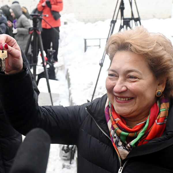 Адвокат покупательницы квартиры певицы Ларисы Долиной Полины Лурье Светлана Свириденко демонстрирует перед журналистами ключи от квартиры, 19 января 2026 года