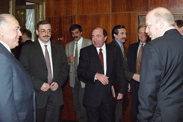 Премьер-министр РФ Виктор Черномырдин (слева), Михаил Ходорковский (признан в РФ иностранным агентом и внесен в список террористов и экстремистов) (второй слева), Борис Березовский (второй справа), Александр Смоленский (справа) после подписания Меморандума о намерениях об объединении нефтяной компании «ЮКОС» и «Сибирской нефтяной компании», 1998 год