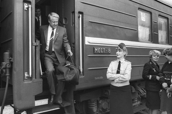 Первый заместитель председателя Госстроя СССР Борис Николаевич Ельцин сходит с поезда, 15 августа 1989 года