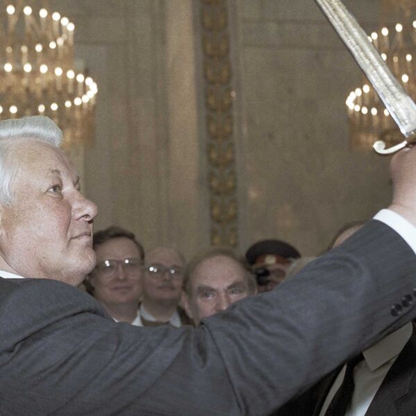 Президент РФ Борис Ельцин держит в руках Меч Победы, изготовленный тульскими мастерами в честь 50-летия победы на фашистской Германией. Мемориал на Поклонной горе, Москва, Россия, 3 мая 1995 года