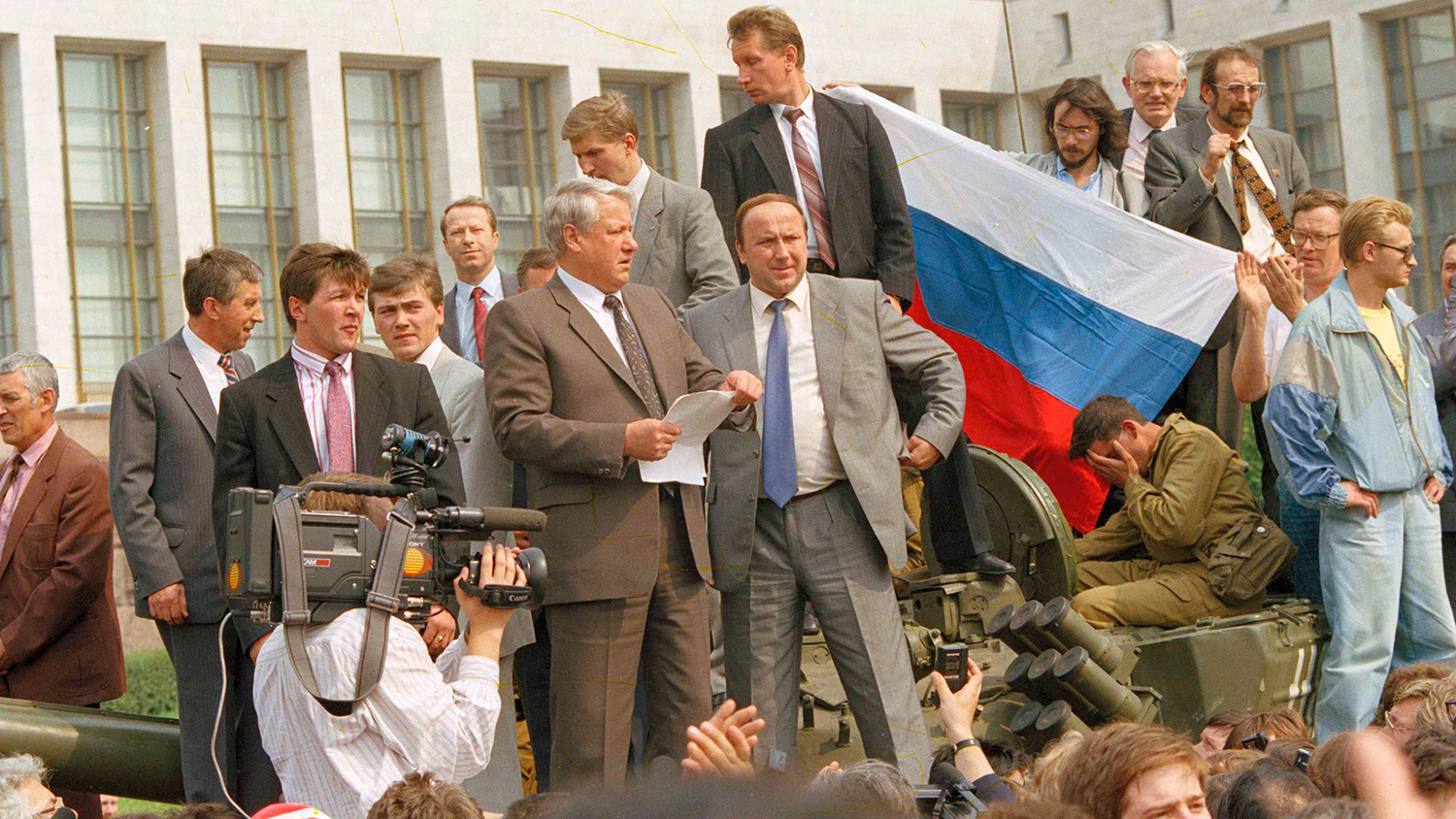 Президент России Борис Ельцин со сторонниками на броне танка у здания Верховного Совета РСФСР во время августовского путча, 1991 год