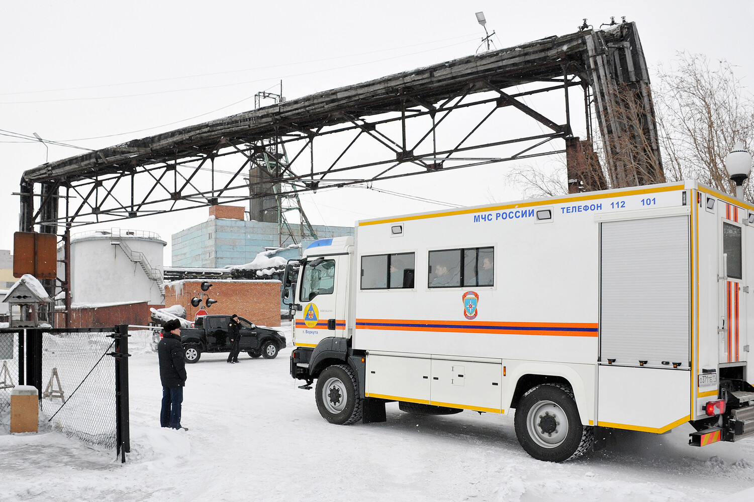 Автомобиль спасательной службы МЧС России на территории шахты «Северная» в Воркуте, 28 февраля 2016 года
