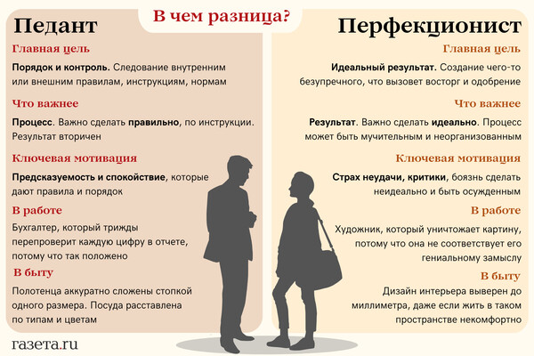 Педант сосредоточен на процессе и соблюдении правил («сделать по инструкции»). Перфекционист зациклен на результате («сделать идеально»). Педант будет доволен, если выполнил работу строго по регламенту, даже если результат не блестящий. Перфекционист же может нарушить все правила и сроки, но добиться безупречного результата.