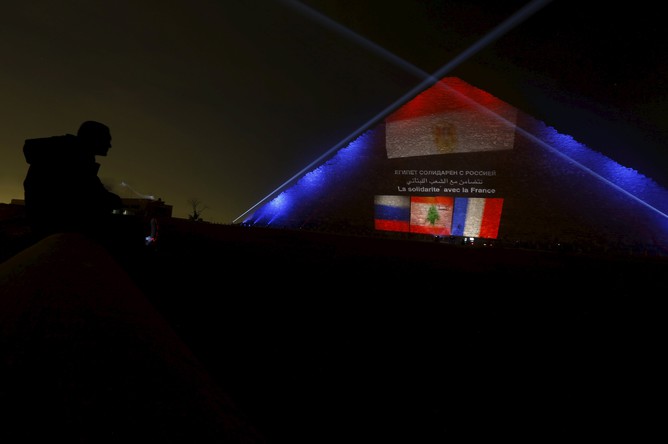 Акция памяти прошла рядом с пирамидой. Помимо флагов на ней также появились надписи о солидарности Египта с Россией, Францией и Ливаном на русском, французском и арабском языках соответственно.