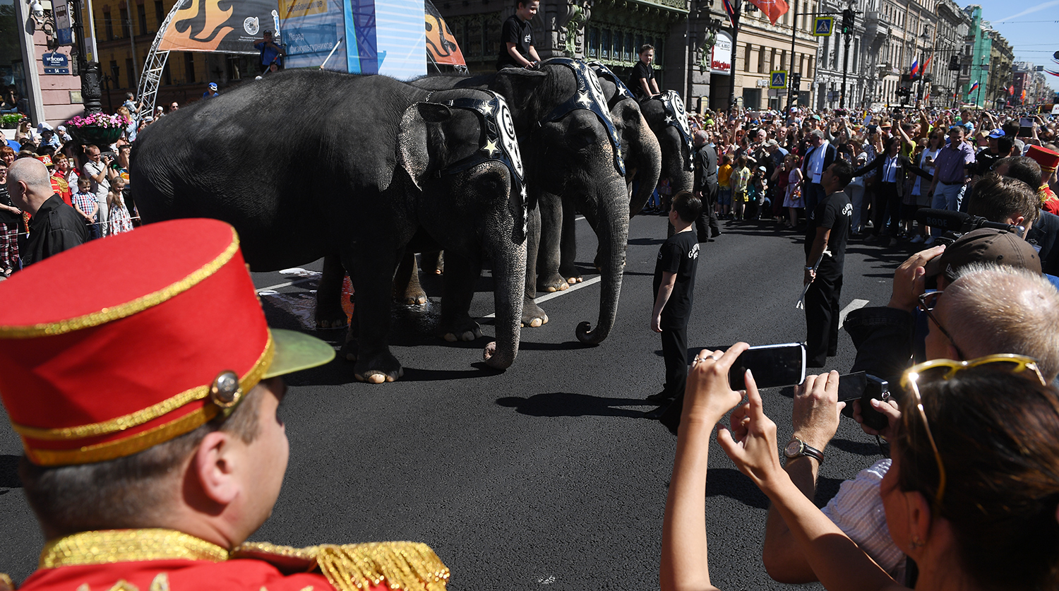 В центре Санкт-Петербурга прошло цирковое карнавальное шествие с участием артистов цирка, дрессированных животных и слонов, сообщают «Невские новости».