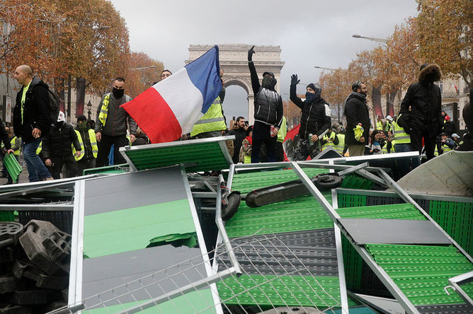 Протестное движение получило название «желтые жилеты» из-за того, что его участники одеты в светоотражающие жилеты, обязательные для водителей. Отмечается, что в Париже находятся около восьми тыс. протестующих находятся в Париже, пять тыс. — на Елисейских полях.