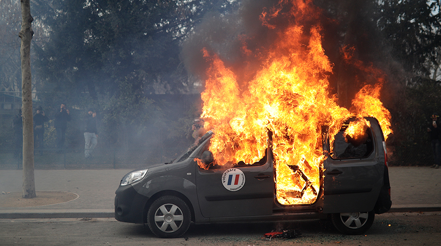 В городе Лион во Франции участники протестного движения «желтые жилеты» напали на полицейский автомобиль, который ехал по пробке. Об этом сообщает BFMTV.