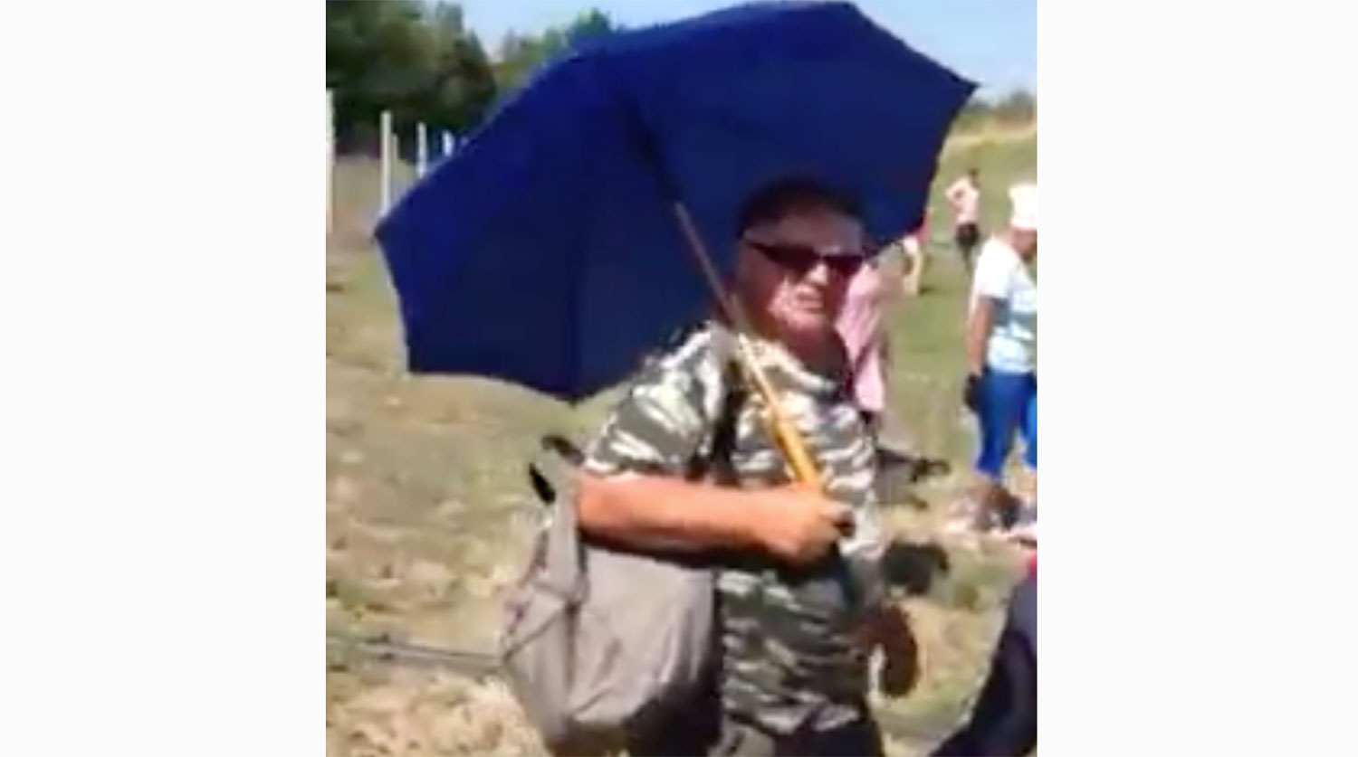 Работодатель кричит на рабочих и пытается ударить большим зонтиком.