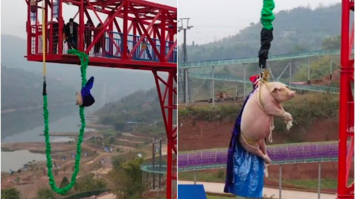 В китайском городе Чунцин свинью привязали к тарзанке и кинули с 68-метровой вышки. Об этом сообщает Би-би-си.