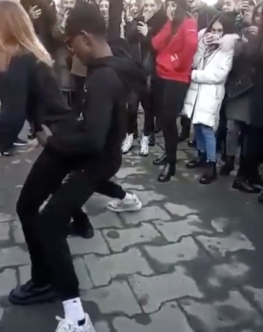 На видео видно, как юноша вплотную прижимается к девушке и двигается с ней в такт. При этом толпа реагирует по-разному, кто-то кричит ему «Хорош!», женская половина от удивления прикрывает лицо рукой.
