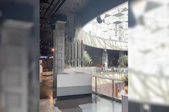 На кадрах видно, как грязная вода потоком течет с верхних этажей вниз. СМИ уточняет, что залитым уже оказался весь центральный атриум.