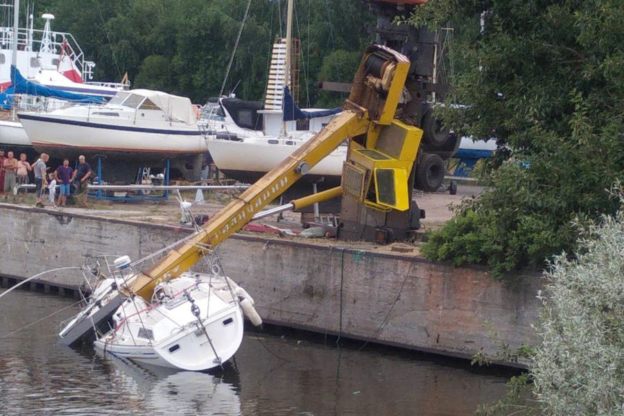 Очевидцы отметили, что этот кран не справился с задачей по подъему яхты. Никто не пострадал в результате происшествия.