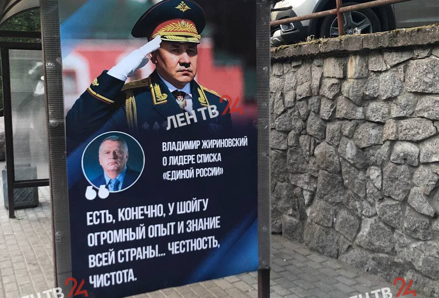 «Есть, конечно, у Шойгу огромный опыт и знание всей страны… Честность. Чистота» - передаёт цитату Жириновского надпись на плакате.