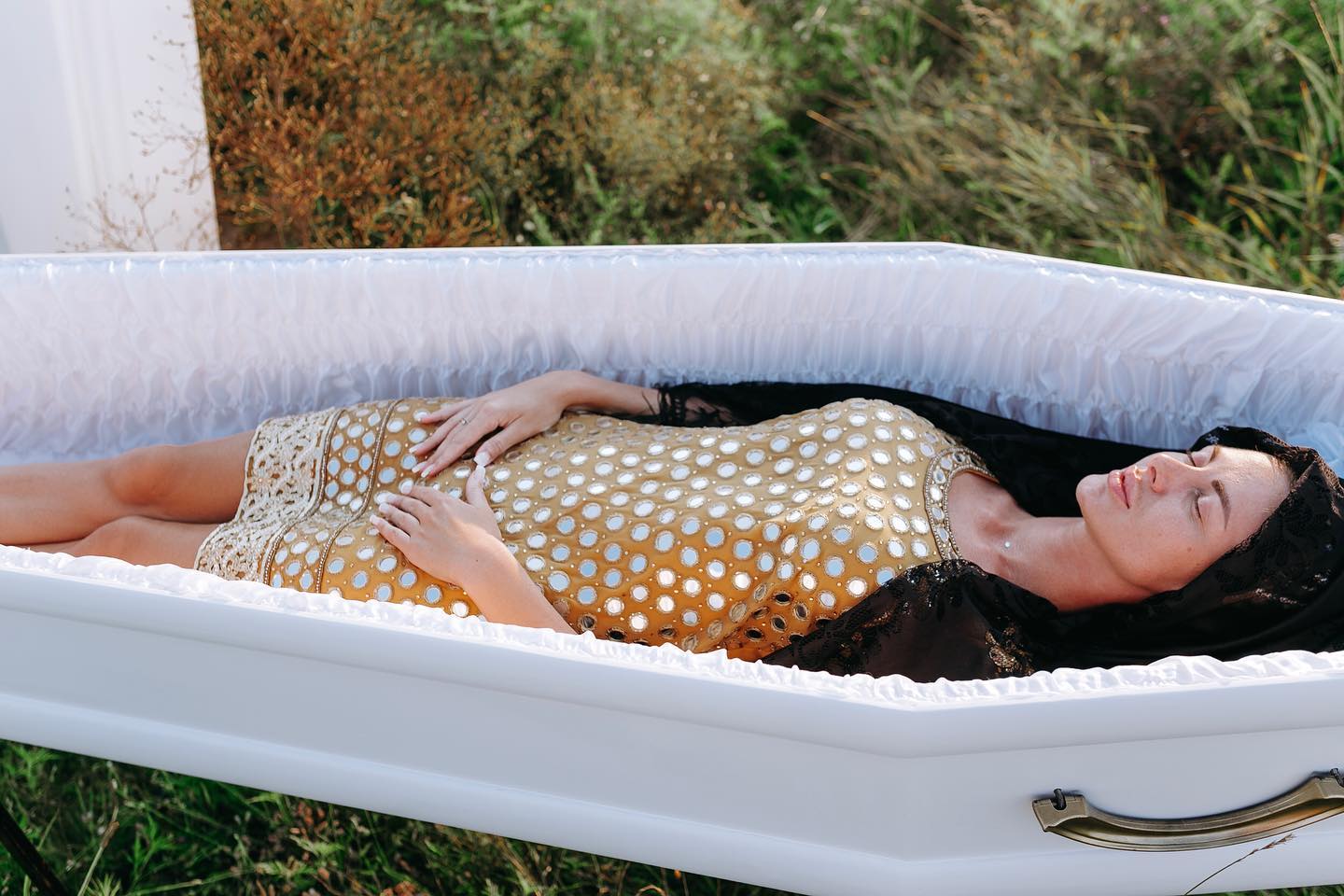 К посту прикреплены 10 фотографий девушек, лежащих в гробах в платьях разных цветов и фасонов. Для полноты образа в руки одной из моделей положили розу. На заднем плане на фото виднеется ритуальный венок.