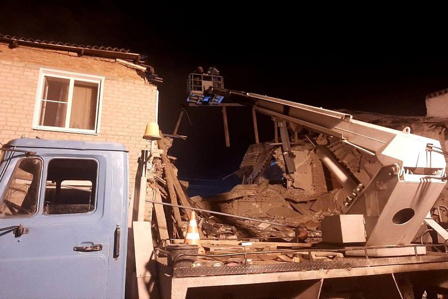 На кадрах видно, как на месте работают сотрудники МЧС. Один из двух подъездов двухэтажного дома полностью разрушен. Разбор завалов продолжается.