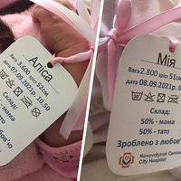 На бирках указаны стандартные данные: имя ребенка, рост, вес, дата и время рождения. Но кроме того там добавили «состав» ребенка: 50% – мама, 50% – папа и специальные символы, которые используются на бирках для одежды: не гладить утюгом, не выжимать, не отбеливать, запрещена химчистка. Стирать «изделие» можно при температуре 30 градусов.