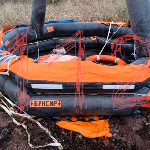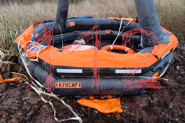 На снимках запечатлены спасательные плот и лодка. Внутри плота видны красные спасательные круги.