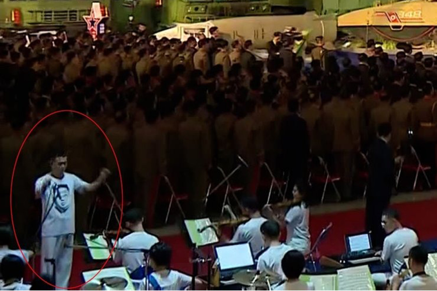 В футболке с портретом главы республики появился на публике дирижер военного оркестра на открытии выставки в Пхеньяне, трансляция выступления которого велась на Центральном корейском телевидении.