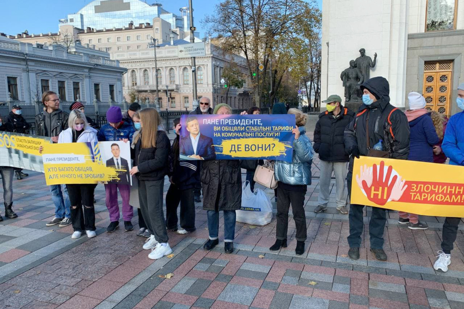 На манифестацию собрались несколько сотен человек, они держат плакаты с надписями: «Остановите повышение тарифов ЖКХ», «Зеленые (команда президента Владимира Зеленского — прим. ред.) обещали нам стабильные тарифы на ЖКХ. Где они?», «Замерзнуть или влезть в долги — что мне делать зимой?», «Украинцам — украинский газ».