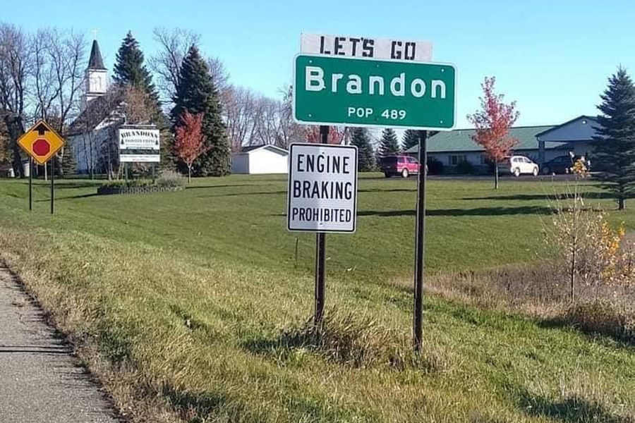 В американском городке Брэндон в Миннесоте добавили надпись к дорожному знаку на въезде в город. Над названием населенного пункта появилась подпись «Let's go!», в результате чего получилась фраза «Let's go, Brandon!», ставшая популярной среди американских консерваторов и означающая «К черту Байдена!».
