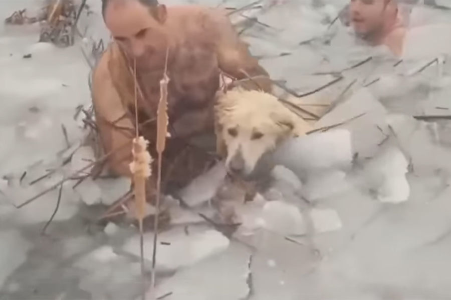 На кадрах видно, как одному из правоохранителей приходится палкой пробивать дорогу через корку льда на поверхности водоема. После того, как он смог подобраться поближе к собаке, животное само подплыло к нему и с помощью полицейских выбралось на берег.