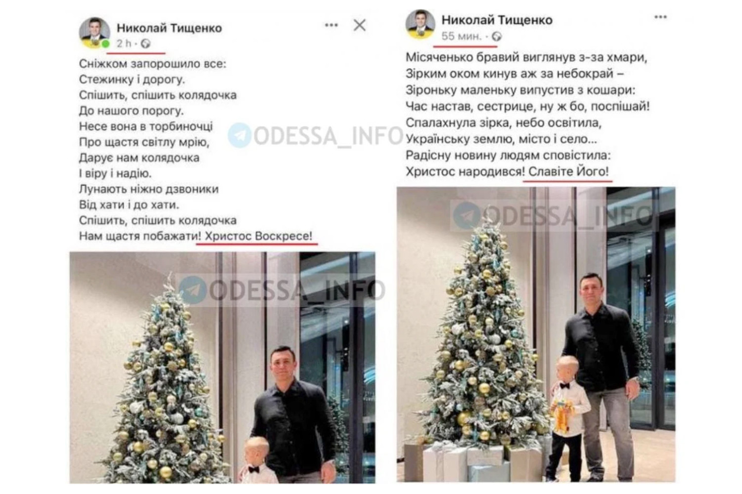 В публикации он прикрепил фотографию у елки и стихотворение, которое заканчивается фразой: «Христос Воскресе». На момент написания новости Тищенко удалил сообщение и опубликовал правильный вариант поздравления, но пользователи успели сделать скриншоты.