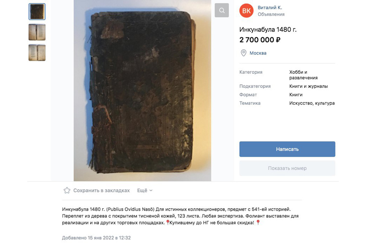 В Москве в «Объявлениях ВКонтакте» выставлена на продажу первопечатная книга эпохи Гутенберга — инкунабула 1480 года с произведениями древнеримского поэта Публия Овидия Назона. Продавец оценивает свой товар в 2,7 млн рублей, о чем говорится в пресс-релизе социальной сети, поступившем в распоряжении «Газеты.Ru».