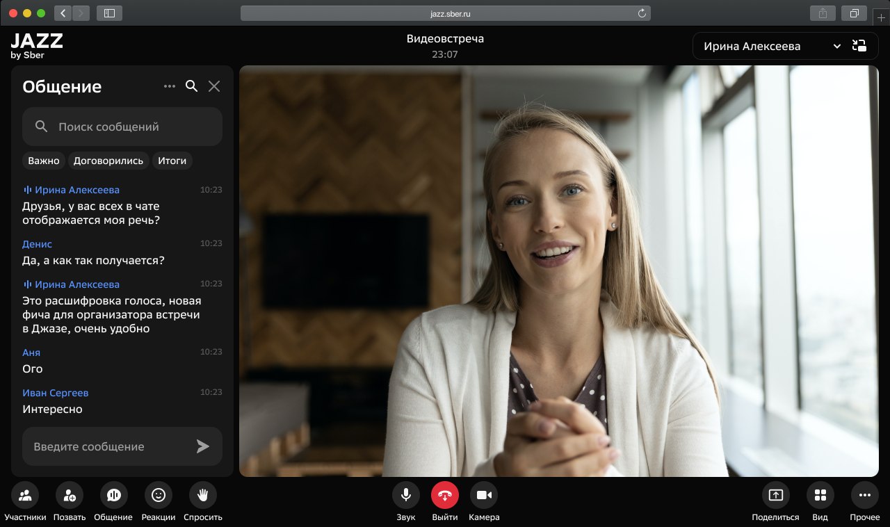 Воспользоваться расшифровкой можно в десктопном приложении Jazz by Sber Desktop и в веб-версии сервиса. Теперь во время встречи пользователь может больше концентрироваться на общении, а не на ведении заметок. Также транскрибация поможет быстро включиться в беседу опоздавшему или временно отвлекшемуся от нее участнику, сделает проще и удобнее использование видеозвонков для людей с нарушением слуха.