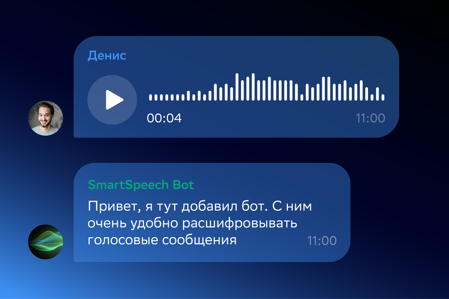 Голосовое сообщение или файл преобразуются ботом в текст благодаря технологии распознавания речи (Automatic Speech Recognition, ASR) платформы SmartSpeech от SberDevices. Данная технология может применяться бизнесом в интерфейсах голосового ввода, например, на веб-сайтах.