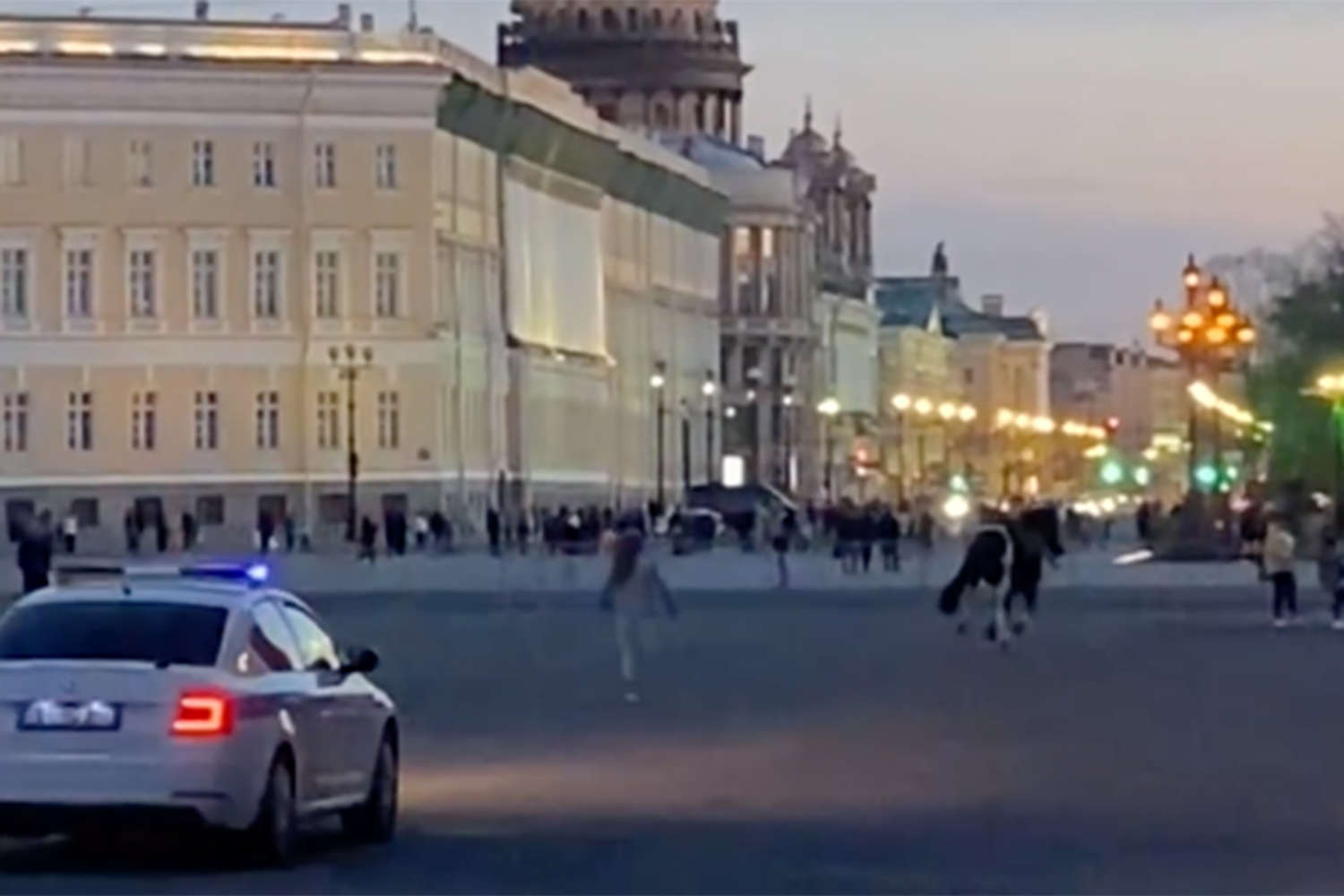 В Санкт-Петербурге на Дворцовой площади сотрудники ДПС с мигалками ловили сбежавшую лошадь. Видео с моментом инцидента выложили очевидцы в группе «Санкт-Петербург | Питер» в соцсети «ВКонтакте».